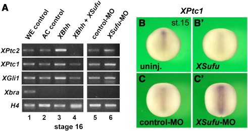 Fig. 6. XSufu inhibits Hh/Gli signaling in the Xenopus embryo. (A) Molecular analysis by RT-PCR of animal cap (AC) explants cultured until stage 16. Animal injection of 500 pg XBhh mRNA elevates the expression of XPtc2, XPtc1, and XGli1, and this effect is reverted by co-injection of 16 ng XSufu mRNA. XSufu-MO, but not control-MO, increases the expression of these Hh target genes. H4 was used for normalization. (B,Bâ²,C,Câ²) Whole-mount in situ hybridization of early neurula embryos in dorsal view. Animal injection of 15 ng XSufu mRNA reduces, while XSufu-MO, but not control-MO, expands the expression of XPtc1 expression. Indicated effects were observed in: B, 61/61; Bâ², 29/38; C, 58/58; Câ², 32/37.