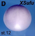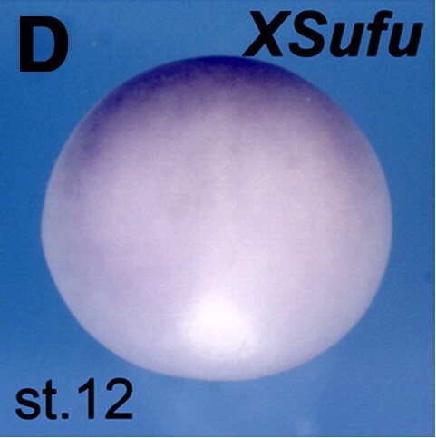 sufu (suppressor of fused homolog) gene expression in Xenopus laevis embryo, assayed via in situ hybridization, NF stage 12, blastoporal view, dorsal up.