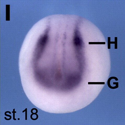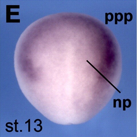 sufu (suppressor of fused homolog) gene expression in Xenopus laevis embryo via in situ hybridization, NF stage 18, anterior view, dorsal up.