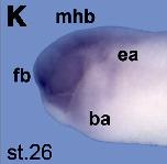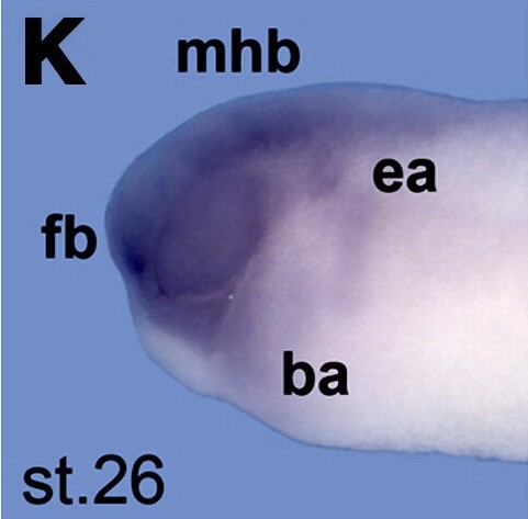 sufu (suppressor of fused homolog) gene expression in Xenopus laevis embryo via in situ hybridization, NF stage 26, later view, dorsal up, head region only.