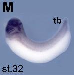 sufu (suppressor of fused homolog) gene expression in Xenopus laevis embryo via in situ hybridization, NF stage 32, later view, dorsal up.