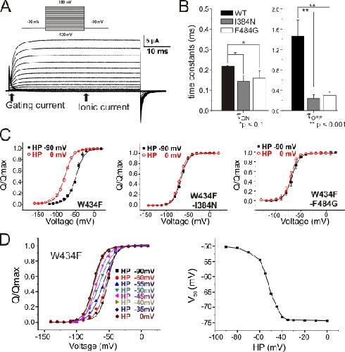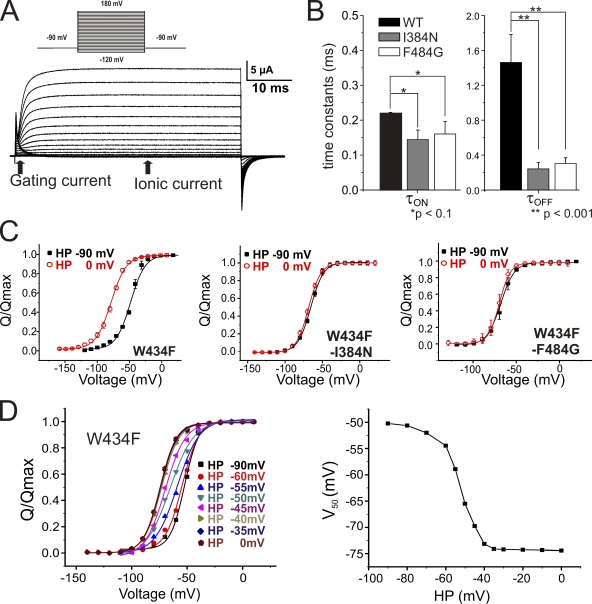 Figure 2. Mode shift is removed in uncoupled mutants I384N and F484G. (A) Gating and ionic currents in response to a series of depolarizing pulses from a holding potential of Vhold = −90 mV to a potential of −120 to 180 mV in steps of 10 mV elicited from ShakerIR-I384N. Both gating and ionic currents are detectable. (B) Time constants from exponential fits of the gating currents (saturating depolarizations) obtained from W434F (n = 7), W434F-I384N (n = 6), and W434F-F484G (n = 4). (C) QV curves were elicited for holding potentials at −90 (QV90) and at 0 mV (QV0) of ShakerIR-W434F, ShakerIR-W434F-I384N, and ShakerIR-W434F-F484G in response to a series of depolarizing pulses from −160 to 60 mV in steps of 10 mV. No shift of the QVs is observed in the uncoupled mutants (P > 0.3) except for W434F (P < 0.0001). (D) QV relations of ShakerIR-W434F in response to a series of pulses from a given holding potential (HP) to variable voltages. (right) V1/2 of single Boltzmann fits as a function of the holding potential of the data on left. The shift occurs at voltages between −60 and −40 mV. (B–D) Data are shown as mean ± SD.