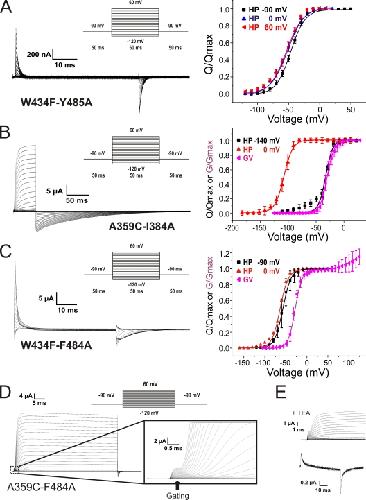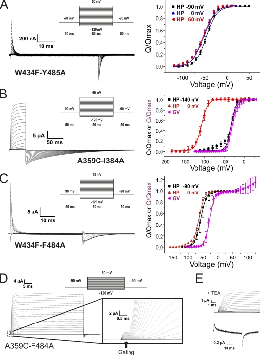 Figure 3. Open state stabilization, strong and weak coupling. (A) Gating currents of ShakerIR-W434F-Y485A in response to a series of depolarizing pulses (50 ms) from a holding potential (HP) of −90 mV to voltages between −120 and 60 mV in steps of 10 mV. (right) Corresponding QV relations for holding at 60, 0, and −90 mV are shown. Only a very modest mode shift is observed (P > 0.2). (B) Ionic currents of ShakerIR-A359C-I384A in response to a series of depolarizing pulses (50 ms) from a holding potential of −90 mV to voltages between −120 and 60 mV in steps of 10 mV. (right) Corresponding QV relations for holding at 0 and −140 mV and the GV (Vhold = −140 mV) are shown. The QVs are significantly shifted (P < 0.0001). (C) Gating currents of ShakerIR-W434F-F484A in response to a series of depolarizing pulses (50 ms) from a holding potential of −90 mV to voltages between −120 and 60 mV in steps of 10 mV. (right) Corresponding QV relations for holding at 0 and −90 mV are shown. They are not significantly shifted to one another (P > 0.7). (A–C) Data are shown as mean ± SD. (D) Gating and ionic currents of ShakerIR-F484A in response to depolarizing pulses from −90 mV to voltages between −120 and 60 mV in steps of 10 mV. (E) Effect of 100 mM TEA (top) and change in reversal potential to −30 mV in the presence of TEA (bottom; V = −70 mV). Only ionic current is affected, whereas gating currents remain the same.