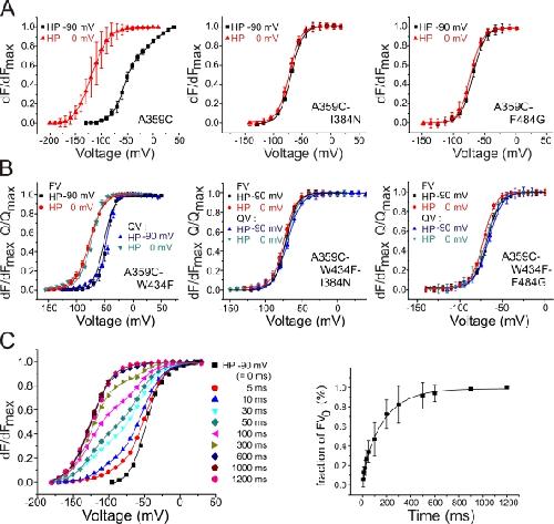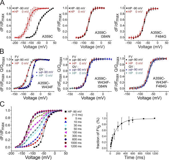 Figure 4. Mode shift in Shaker K+ channels. (A) FV curves for the three mutants ShakerIR-A359C, ShakerIR-A359C-I384N, and ShakerIR-A359C-F484G for holding potential (HP) at −90 and 0 mV in response to a series of depolarizing pulses to a potential of −120 to 60 mV and 40 to −160 mV, respectively. Reversal potential was adjusted to 0 mV. The FVs of A359C were significantly shifted (P < 0.0001), and the uncoupled mutants were not (P ≥ 0.3). (B) Comparison of FV and QV curves of the three mutants ShakerIR-A359C-W434F, ShakerIR-A359C-W434F-I384N, and ShakerIR-A359C-W434F-F484G for holding potentials at −90 and 0 mV in response to voltage pulses of 50-ms duration to voltages ranging between −160 and 50 mV in steps of 10 mV. (C) FV of ShakerIR-A359C from a holding potential of −90 mV to a prepulse of 0 mV for variable duration (0–1,200 ms) followed by a series of pulses of 50 to −160 mV in steps of 10 mV. The FV curves were fitted to a sum of two Boltzmann curves. (right) The fraction of the FV0 Boltzmann as a function of the duration of the depolarizing prepulse is shown. (A–C) Data shown are mean ± SD.