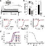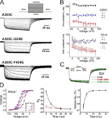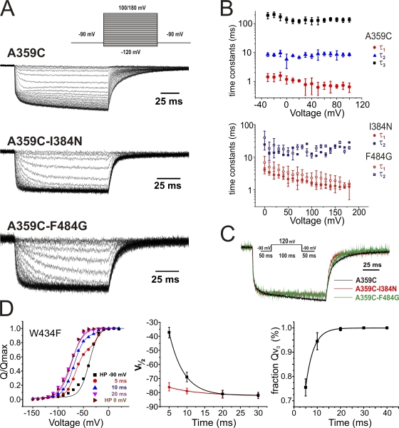 Figure 5. Fluorescence signal indicating conformational changes of S4. (A) Fluorescence response to depolarizing pulses from −90 mV to voltages between−120 and 100 mV and 180 mV for ShakerIR-A359C and ShakerIR-A359C-I384N/F484G, respectively, for a duration of 100 ms. Channels are fluorescently labeled with tetramethyl-rhodamine maleimide at position A359C on top of the S4. (B) Time constants of exponential fits of the onset of the fluorescence signal obtained in A. (C) Comparison of fluorescence signals for saturating pulses of ShakerIR-A359C (V1/2 = −37.5 mV), ShakerIR-A359C-I384N (V1/2 = −55.4 mV), and ShakerIR-A359C-F484G (V1/2 = −56.8 mV). (D) QV of ShakerIR-W434F from a holding potential (HP) of −90 mV to a prepulse of 0 mV for variable duration (0–50 ms) followed by a series of pulses of 30 to −160 mV in steps of 10 mV. The QV curves were fitted to a sum of two Boltzmann curves. (middle) The shift of the V1/2 of the two Boltzmann distributions as a function of the duration of the depolarizing prepulse is shown. The shifts were fitted to single exponentials with time constants of τ = 4.0 and 8.8 ms for more positive and more negative ones, respectively. (right) The fraction of the QV0 Boltzmann as a function of the duration of the depolarizing prepulse is shown. (B and D) Data shown are mean ± SD.