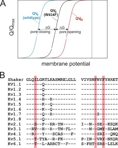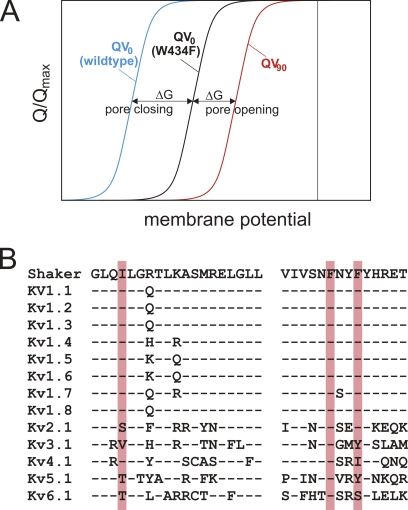 Figure 6. Alignment of Kv channels and energetics of mode shift. (A) Mode shift of the charge movement in ShakerIR and ShakerIR-W434F and relationship with the energies of pore opening and closing. (B) Alignment of the S4-S5 linker and C-terminal S6 region of human Kv channels. I384, F481, and F484 are highlighted.