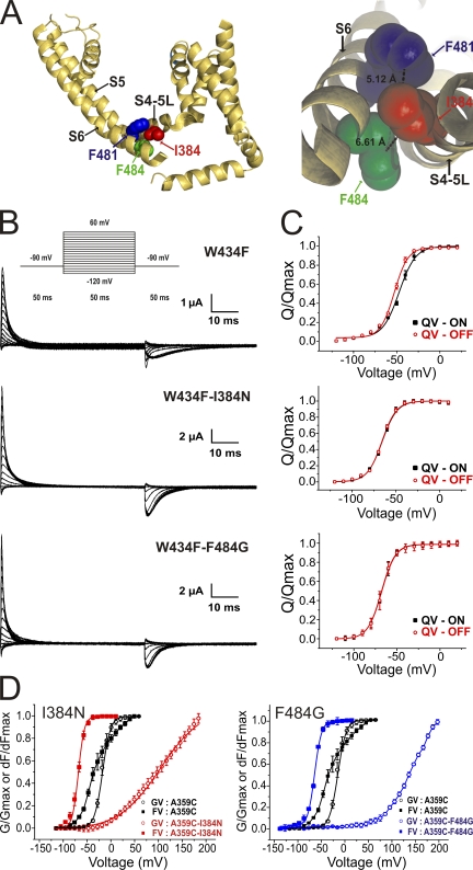 Figure 1. Uncoupling mutants I384N and F484G. (A) Location of the uncoupled mutants in the Kv1.2 crystal structure (Long et al., 2005a). Shown is a single subunit. I384 is located on the S4-S5 linker, and F481 and F484 are located on the C-terminal S6, which anneals to the S4-S5 linker. (right) Magnification of the interaction site. (B) Gating currents of ShakerIR-W434F, ShakerIR-W434F-I384N, and ShakerIR-W434F-F484G in response to a series of depolarizing pulses from a holding potential of Vhold = −90 mV to a potential of −120 to 60 mV in steps of 10 mV for 50 ms. (C) QVON and QVOFF of ShakerIR-W434F, ShakerIR-W434F-I384N, and ShakerIR-W434F-F484G. (D) Fluorescence voltage (FV) and conductance voltage (GV) relations for ShakerIR-A359C, ShakerIR-A359C-I384N, and ShakerIR-A359C-F484G elicited from a series of depolarizing pulses from a holding potential of Vhold = −90 mV to a potential of −120 to 60 mV/200 mV in steps of 10 mV for a duration of 50 ms. QV and GV are far separated in the uncoupled mutants I384N and F484G. (C and D) Data are shown as mean ± SD.