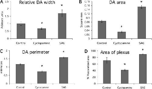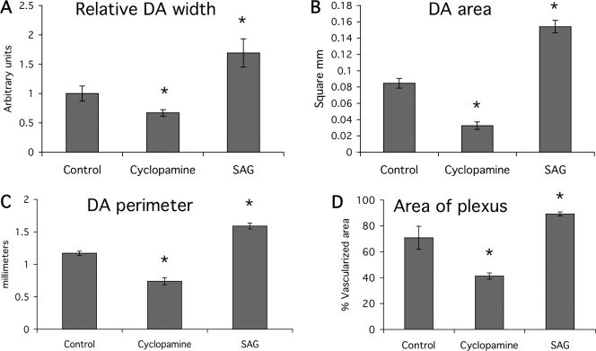 Figure 3. Quantitation of the structure of the dorsal aortae (DA) and the vascular plexus in quail embryos with inhibited and activated hedgehog (Hh) signaling. A: Relative width of the DA in control, cyclopamine and SAG-treated embryos. Measurements were made from photographs of QH1 stained whole-mount embryos. Measurements were made for each DA at five positions along the AP axis, including at least three embryos for each treatment. B: Measurements of DA area were made by analysis of digital photographs of QH1 stained sections using Image J. Measurements were made at five positions along the AP axis, including at least 3 embryos for each treatment. C: Measurements of DA perimeter (the length of the inside of the DA vessel wall) were made by Image J analysis of the same digital photographs used in (B). Measurements were made at five positions along the AP axis, including at least three embryos for each treatment. D: Area of the vascular plexus was determined by Image J analysis of digital photographs. At least five embryos were assayed for each treatment. In all cases, the measurements for cyclopamine and SAG treated embryos are significantly different from control values (P < 0.05, Student's t-test, indicated by asterisks).Download figure to PowerPoint