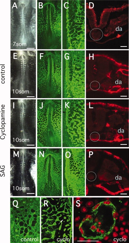 Figure 2. Antibody analysis of vascular formation in quail embryos treated with cyclopamine or SAG. Vascular tissues were detected using QH1 antibody. AâP: The first column shows bright field images of embryos, the second column shows identical embryos stained with QH1, the third column shows magnified images of the vascular plexus region and the fourth column, shows cross-sections through QH1-stained embryos at the level of the fifth somite. AâD: Characterization of embryos at the seven-somite stage, before initiation of treatment. At this stage, a complex network of vascular cords has assembled, but tubulogenesis has only commenced in the most anterior regions of the paired dorsal aortae (DA). Sections at the level of the fifth somite (D) show that angioblasts have assembled at the region of the future DA (da), but tube formation has not started. EâH: Characterization of control embryos at the 10-somite stage at the completion of treatment. The DAs are prominent continuous structures and an elaborate sinusoidal plexus has formed in the adjacent mesoderm. The section image (H) shows the presence of the tubular DA (da). IâL: Characterization of 10-somite stage embryos treated with cyclopamine. Relative to controls, the DA are narrower and much more irregular in appearance. The vascular plexus in less dense and in some places discontinuous. Despite the general disruption of vascular patterning, the section image (L) reveals that tube formation has occurred. MâP: Characterization of 10-somite stage embryos treated with SAG. Relative to controls the DA are wider and the vascular plexus is very dense. The section image at the level of the fifth somite shows the extremely large tubular DA (da). Q: QH1-stained vascular plexus from a control embryo at 10-somites. R: Equivalent region of the vascular plexus from an embryo treated with cyclopamine. In this pronounced example, the plexus has low density and many angioblasts exist in isolated aggregates rather than assembled into cords. S: Confocal image of the isolated angioblast aggregate (indicated by arrow in R), showing the presence of a lumen. QH1 is green, propidium iodide staining for nuclei is red. In panels D, H, L, P, the location of the notochord is indicated by the dotted circle. Scale bar in the first column is 0.5 mm, and in the last column is 100 micrometers. Scale bar = 50 μm in S.Download figure to PowerPoint