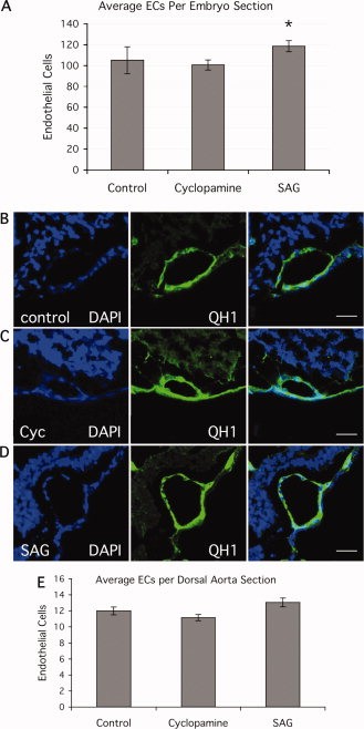 Figure 4. The number of cells comprising vascular structures is little changed after inhibition or activation of hedgehog (Hh) signaling. After experimental treatment, quail embryos were stained with QH1 to detect angioblasts and DAPI (4â²,6-diamidine-2-phenylidole-dihydrochloride) to mark nuclei. A: Endothelial cell (EC) number was determined by counting number of nuclei corresponding to QH1 stained cells. Five sections were counted for each embryo, with at least three embryos for each treatment. The number of ECs in SAG treated embryos is significantly different from controls and cyclopamine-treated embryos (asterisk). BâD: Determination of number of ECs comprising the dorsal aortae (DA). Confocal images of sections at approximately the level of the fifth somite. From left to right the panels show DAPI stain, QH1 stain and the merged image. Representative images are shown for a single DA in control (B), cyclopamine-treated (C) and SAG-treated embryos (D). Scale bar = 100 μm. E: Number of cells contributing to the wall of the DA. DAPI-stained nuclei contained in the wall of the vessels (QH1 stained) were counted. Cells in both DA were counted in at least five sections per embryo, for at least three embryos for each treatment. Despite differences in the size of the vessels, the number of ECs comprising the walls was unchanged by the different treatments.Download figure to PowerPoint