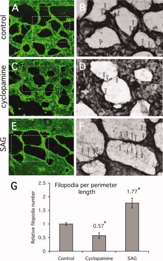 Figure 5. Relative number of EC filopodia correlates with hedgehog (Hh) signaling levels. After experimental treatment, quail embryos were stained with QH1 to mark endothelial cells (ECs) and images of the vascular plexus were obtained using confocal microscopy. A: Image of region of vascular plexus from posterior of embryo, adjacent to dorsal aorta (just out of frame at top), of control embryo. B: Inverted image (ECs are black) of region outlined in box in A. Filopodia extending from ECs are indicated by open arrowheads. C: Image of vascular plexus of cyclopamine treated embryo. Plexus region is equivalent to that in control. D: Inverted image of region outlined in box in C showing filopodia marked with arrowheads. E: Image of vascular plexus of SAG-treated embryo. Plexus region is equivalent to that in control. F: Inverted image of region outlined in box in E showing filopodia marked with arrowheads. G: Quantitation of relative number of filopodia following different treatments. Total number of filopodia were counted and then normalized against length of perimeter (edge). Length of perimeter was calculated using Image J. Plexus on both sides of midline was counted for at least three embryos for each treatment. Results show that the relative number of filopodia correlates with the level of Hh signaling and that both cyclopamine and SAG treatments are significantly different from controls (P < 0.05, Student's t-test, indicated by asterisks).Download figure to PowerPoint