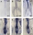 Figure 6. Vegfa but not Notch1 expression levels change when hedgehog (Hh) signaling is altered. In situ hybridization analysis of chick embryos was used to examine expression of Vegfa (AâC) and Notch1 (DâF) after treatment with Hh inhibitor (cyclopamine, 100 μM) or activator (SAG, 20 μM). A: Embryo treated with cyclopamine showing reduced expression of Vegfa compared with controls. B: Control embryo showing normal Vegfa expression pattern. C: Embryo treated with SAG showing increased expression of Vegfa compared with controls. DâF: Embryos treated with either cyclopamine (D) or SAG (F), showed Notch1 expression patterns indistinguishable from control embryos (E). Arrows indicate Notch1 expression in the endothelium.Download figure to PowerPoint