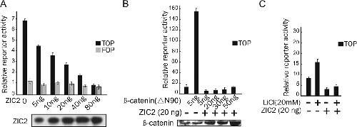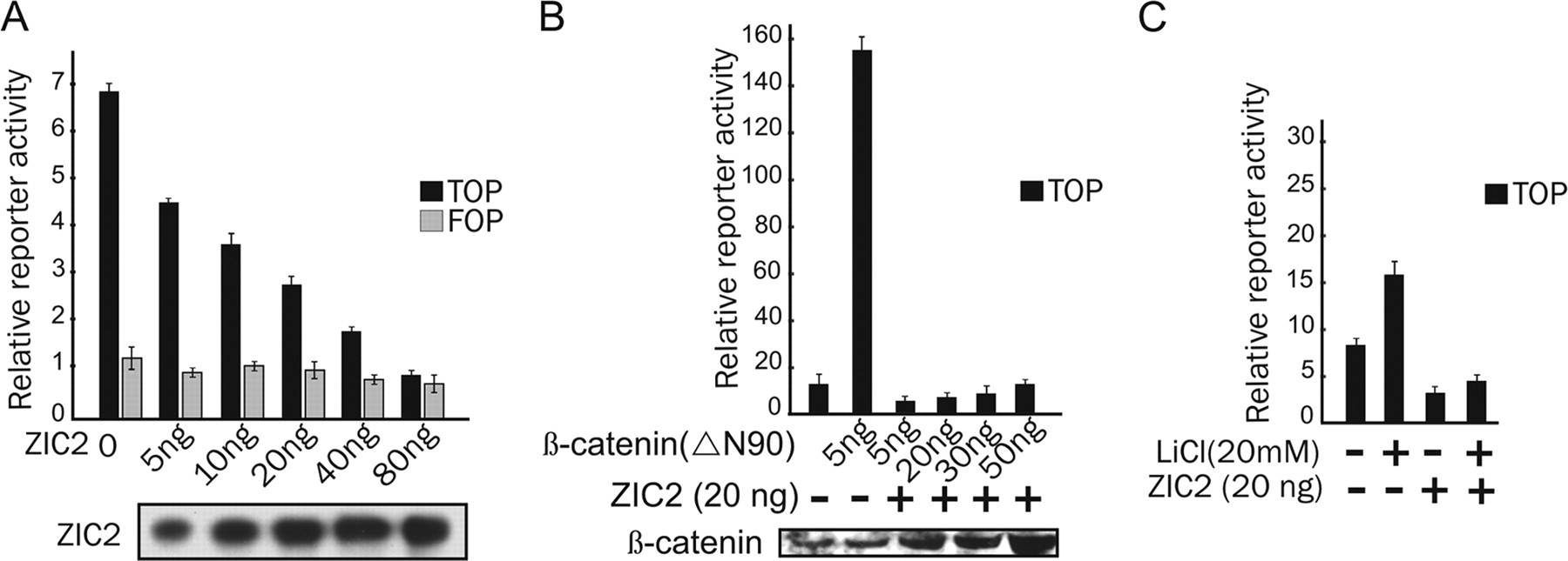 ZIC2 negatively regulates the transcriptional activity of the β-catenin·TCF4 complex in 293T cells. A, activity of the TOPflash or FOPflash reporter in 293T cells transfected with ZIC2 expression vector in different amounts. B, TOPflash reporter activity of 293T cells transfected with ZIC2-expressing plasmid (20 ng) and increasing amounts of ÎN90-β-catenin-expressing plasmid (5â50 ng). The Western blot shows the levels of overexpressed proteins under each condition. C, TOPflash reporter activity of 293T cells treated with 20 mm LiCl for 12 h after transfection with the indicated plasmids.