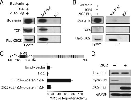 ZIC2 binding to TCF4. Cell lysates of 293T cells transfected with ZIC2-FLAG- and β-catenin-expressing plasmids together with TCF4-expressing vector (A) or without TCF4 (B) were subjected to immunoprecipitation (IP) using anti-FLAG antibody. C, schematic representation of LEFÎN-β-cateninÎN53 fusion protein. The graph shows the TOPflash reporter activity of 293T cells after transfection with the expression plasmids as indicated. D, Western blot showing the levels of the indicated proteins after FLAG-tagged ZIC2 overexpression in 293T cells.