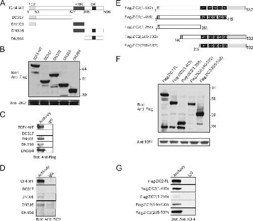Mapping the ZIC2·TCF4 interaction domains. A, schematic representation of the different TCF4 mutants. The HMG domain and C-terminal region (CR) are represented as dark gray boxes. The β-catenin-interacting domain (β-Cat) is represented as a light gray box. B, Western blot showing transient coexpression of FLAG-tagged TCF4, deletion mutants, and ZIC2 using the indicated antibodies. C, immunoprecipitated proteins using anti-ZIC2 antibody (or IgG as a mock) were subjected to Western blot analysis for FLAG detection. D, immunoblot of in vitro protein binding assay. FLAG-tagged TCF4 and its truncated forms were purified with anti-FLAG beads (with IgG serving as a mock) and incubated with in vitro translated ZIC2, and the precipitated complex was subsequently subjected to immunoblotting using antibody against ZIC2. E, schematic representation of ZIC2 and its deletion constructs. Zinc finger domains are represented as dark gray boxes. F indicates FLAG. F, Western blot showing the protein levels of overexpressed full-length ZIC2, ZIC2 deletions, and TCF4 using the indicated antibodies. G, proteins immunoprecipitated from the lysates in F using anti-FLAG antibody (or IgG as a mock) were analyzed by Western blotting using anti-TCF4 antibody.