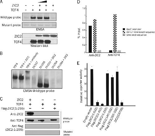 Complex of ZIC2·TCF4 bound on DNA. A, EMSA was done by incubating a cell extract of 293T cells transfected with different expression plasmids as indicated with biotin-labeled probes containing wild-type or mutant TCF4-binding sequence. The lower panels represent Western blots of the corresponding samples as indicated. B, EMSA using 293T cells cotransfected with full-length TCF4 and its deletions together with ZIC2-expressing plasmid. Where indicated, the samples were preincubated with antibody against TCF4. C, DNA affinity precipitation of 293T cells transfected with the indicated expression vectors was performed as described under âExperimental Procedures.â The lysates were incubated with wild-type or mutant biotinylated probes corresponding to the TCF4-binding sequence, and the precipitated DNA·protein complexes were analyzed by Western blotting using the indicated antibodies. A probe with a mutant TCF-binding sequence was used as a control. D, 293T cells were transfected with ZIC2 and TCF4, and ChIP was performed with the indicated antibodies, followed by quantitative PCR using primer pairs spanning the human AXIN2 TCF4-binding site or an unrelated AXIN2 sequence as negative control. The ApoE promoter served as a positive control for ZIC2 binding. Results are presented as percentage of immunoprecipitated DNA over the input. E, luciferase reporter activity of the Wnt reporter (TOPflash) in 293T cells transfected with the expression vectors as indicated along with the β-catenin (DN90) expression vector.