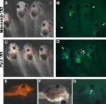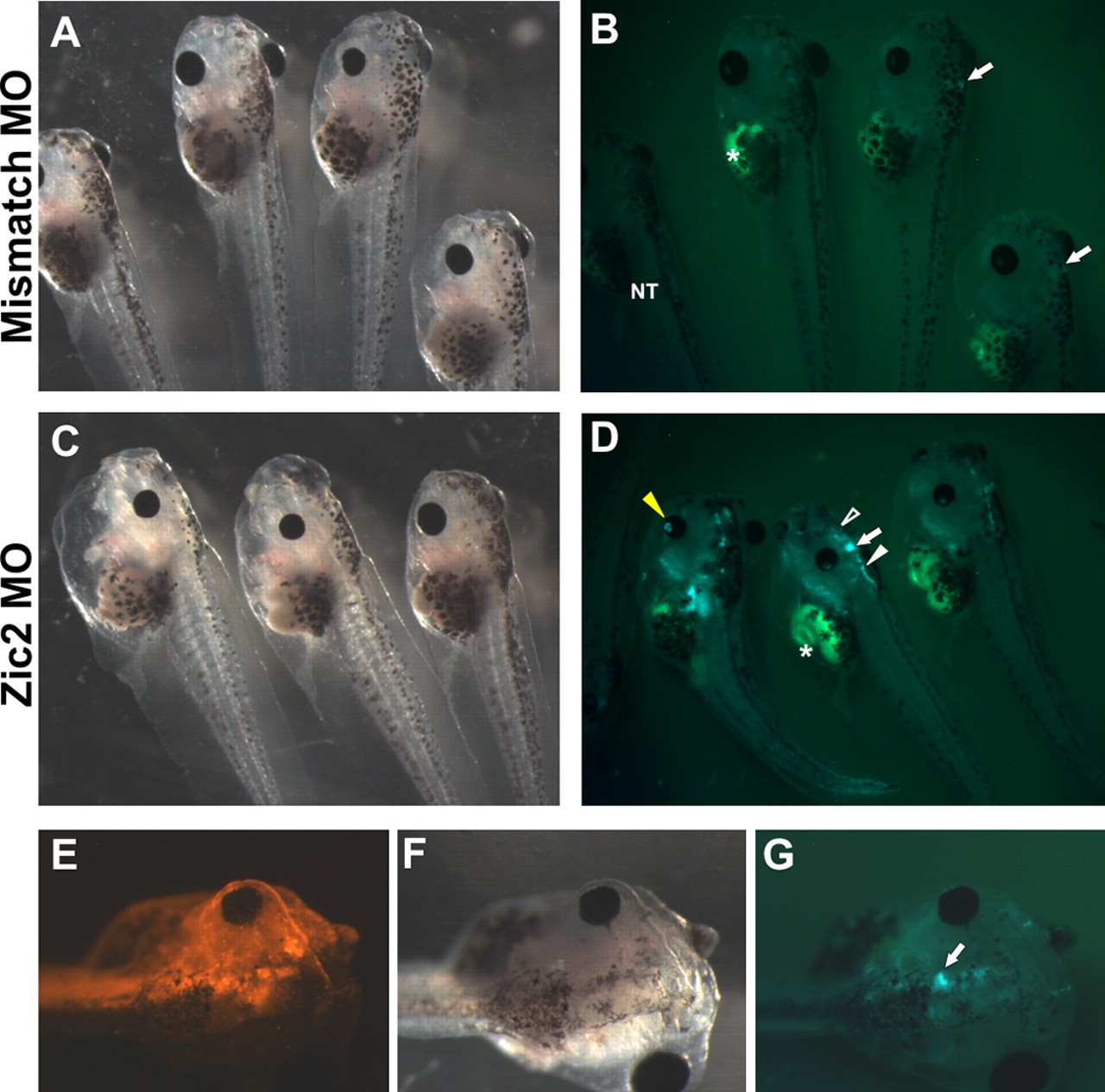 Zic2 morphants display increased Wnt reporter activity in the brain. Lateral views of stage 43 tadpoles injected with 40 ng of mismatch morpholino (MO) show normal development (A) and modest GFP expression (B). Embryos injected with Zic2 morpholino displayed loss of pigmented cells in the head and trunk (C) and markedly increased GFP expression (D), especially in the forebrain (open white arrowhead), the midbrain-hindbrain boundary (arrow), the dorsal side of the hindbrain (closed white arrowhead), and the eyes (closed yellow arrowhead). Note that the intestine shows autofluorescence (asterisk). The left-most tadpole is non-transgenic (NT). EâG, embryo injected unilaterally with Zic2 morpholino together with a red fluorescent LYSAMINE-labeled control morpholino. The injected side shows a marked increase in TOP-GFP expression, especially visible in the midbrain-hindbrain boundary (arrow).
