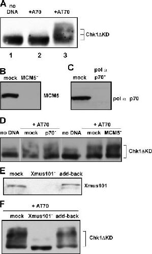 Figure 1. Xmus101 is required, but replication proteins are not, for Chk1 activation in the AT70 system. (A) Recombinant Chk1ΔKD was added to extract, along with no DNA (lane 1), the A70 oligonucleotide (lane 2), or the preannealed AT70 oligonucleotide (lane 3). After a 100-min incubation, samples were taken and the phosphorylation status of Chk1ΔKD was assessed by SDS-PAGE and immunoblotting with the T7 monoclonal antibody (Novagen), which recognizes the T7 epitope tag present on recombinant Chk1ΔKD. The retarded mobility of Chk1ΔKD in lane 3 is due to phosphorylation (Michael et al., 2000). (B) MCM5 was immunodepleted from egg extract. The depleted extract was probed for MCM5 by immunoblotting and compared with a mock-depleted extract. (C) Same as B except that the p70 subunit of pol α was immunodepleted. (D) Mock-depleted and depleted extracts were supplemented with recombinant Chk1ΔKD and AT70. After a 100-min incubation, samples were taken and processed as in A. The lanes labeled “no DNA” refer to extracts incubated without AT70 but with recombinant Chk1ΔKD. (E) Xmus101 was immunodepleted from egg extracts. The depleted extracts were probed for Xmus101 by immunoblotting and compared with a mock-depleted extract. Add-back refers to Xmus101-depleted extracts supplemented with recombinant Xmus101. (F) The extracts depicted in E were assayed for Chk1ΔKD phosphorylation as in A.