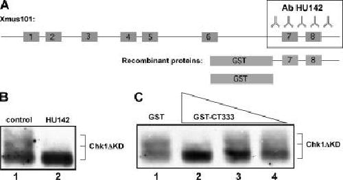Figure 2. Two inhibitors of the Xmus101 Chk1 activation function. (A) A cartoon of Xmus101 showing the region of the protein that was used as antigen to produce the HU142 antibody as well as recombinant proteins used in this study. The numbered boxes refer to BRCT domains (Garcia et al., 2005). (B) Extracts were supplemented with either nonspecific IgG (lane 1) or HU142 (lane 2; final concentration: 50 ng/μl). Both samples were then further supplemented with recombinant Chk1ΔKD and AT70. After a 100-min incubation, samples were taken and probed for Chk1ΔKD as in Fig. 1 A. (C) Either GST (15 μM; lane 1) or GST-CT333 (806 nM, lane 2; 322 nM, lane 3; 161 nM, lane 4) was added to egg extract along with AT70 and Chk1ΔKD. After a 100-min incubation, samples were taken and probed for Chk1ΔKD as in Fig. 1 A.