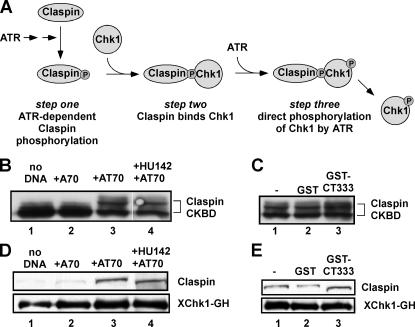 Figure 3. Xmus101 functions after assembly of the Claspin–Chk1 complex during AT70-mediated Chk1 activation. (A) A depiction of the Chk1 activation pathway. (B) Extracts were supplemented with recombinant GST-Claspin CKBD and the following additional components: buffer (lane 1), the A70 oligonucleotide (lane 2), preannealed AT70 oligonucleotides (lane 3), or preannealed AT70 oligonucleotides plus HU142 (final concentration: 50 ng/μl; lane 4). GST-Claspin CKBD phosphorylation was assessed after a 100-min incubation, according to published procedures (Kumagai and Dunphy, 2003). (C) GST-Claspin CKBD shift assay in extracts containing AT70 and buffer (lane 1), GST (15 μM; lane 2), or GST-CT333 (806 nM; lane 3). (D) Extracts were supplemented with bead bound recombinant Xchk1-GH (Kumagai and Dunphy, 2000) and the following additional components: buffer (lane 1), the A70 oligonucleotide (lane 2), preannealed AT70 oligonucleotides (lane 3), or preannealed AT70 oligonucleotides plus HU142 (final concentration: 50 ng/μl; lane 4). After a 100-min incubation, the beads were isolated and washed, and bound proteins were eluted with 2× SDS-PAGE sample buffer. The presence of Claspin and Xchk1-GH in the eluate was then determined by immunoblotting with antibodies against Claspin and GST, respectively (Jeong et al., 2003). (E) Claspin-Chk1 binding assay in extracts containing AT70 and buffer (lane 1), GST (15 μM; lane 2), or GST-CT333 (806 nM; lane 3).