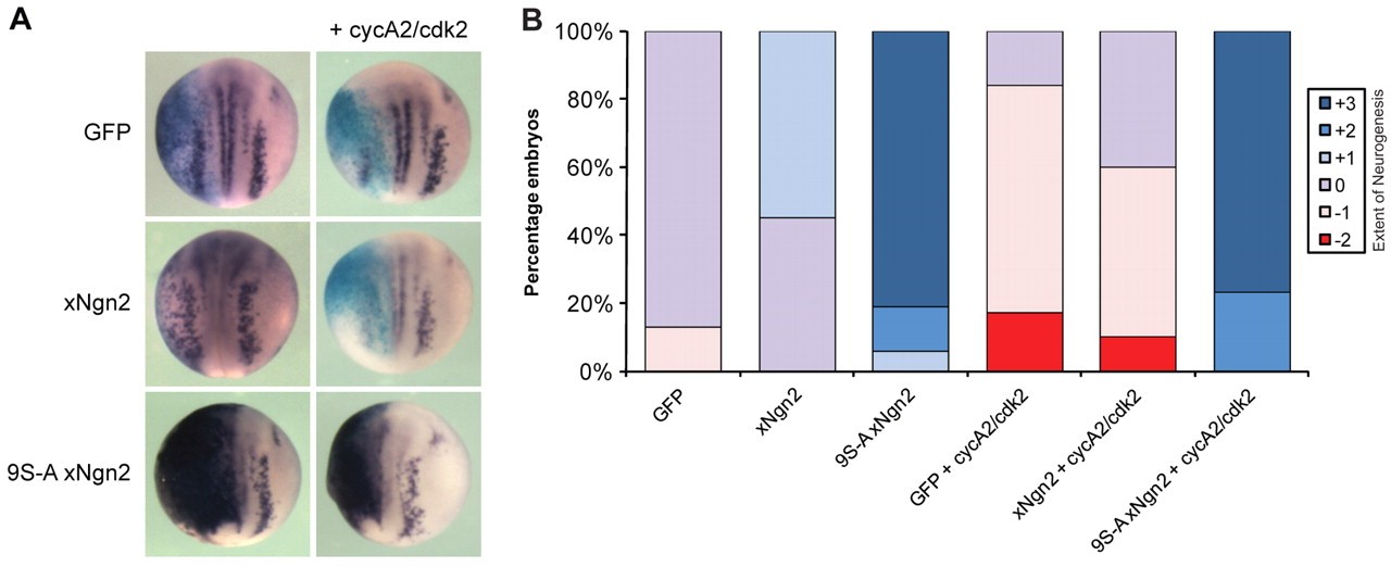 Fig. 6. 9S-A xNgn2 is resistant to cyclin A2/cdk2-mediated suppression of neurogenesis in vivo. (A) Xenopus embryos were injected (left side) in one of two cells with 20 pg xNgn2 or 9S-A xNgn2 mRNA, together with 500 pg cyclin A2 and cdk2 mRNA, assaying for expression of neural β-tubulin at stage 15 by in situ hybridisation. (B) Semi-quantitative analysis of in situ hybridisation data. The number of embryos scored was 48-86 per condition. Neurogenesis was enhanced (+3, +2, +1), the same as (0) or reduced (â1, â2, â3) compared with the uninjected side (see Fig. S8 in the supplementary material).