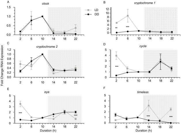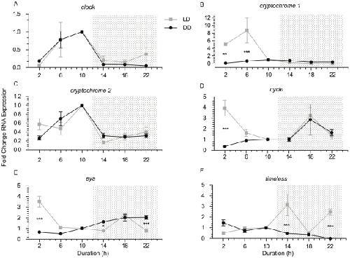 Figure 2. QPCR analysis of candidate circadian gene expression in larvae.Larvae were exposed to either a 12∶12 LD treatment or 12∶12 DD treatment for 24 hours, and were analyzed with QPCR for rhythmicity in candidate circadian genes (a. clock, b. cryptochrome 1, c. cryptochrome 2, d. cycle, e. eyes absent, f. timeless). Relative fold changes (mean ± SEM of triplicate QPCR reactions) in RNA expression levels are presented based on QPCR analysis of the 2009 larval sample. Shaded areas represent periods of darkness, with the exception of DD samples, which were darkened for 24 hours. Bonferroni post-tests were performed to confirm statistical significant differences at each time point. * represents P<0.05, ** represents P<0.01, and *** represents P<0.001.