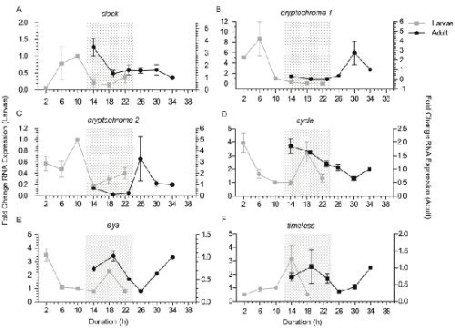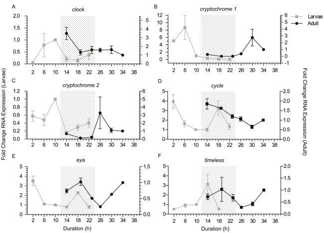 Figure 3. Comparison of larvae and adult diurnal gene expression. QPCR analysis of candidate circadian gene expression in larvae.Larvae and adult tissues were compared using QPCR, to determine similar patterns of gene expression over a 12∶12 LD treatment (a. clock, b. cryptochrome 1, c. cryptochrome 2, d. cycle, e. eyes absent, f. timeless). Relative fold changes in RNA expression levels (mean ± SEM of triplicate QPCR reactions) are presented for both 2009 larvae (primary y-axis) and adult tissue (secondary y-axis). Shaded areas represent the 12 hours of darkness for larvae (12∶12 LD) and 11 hours of darkness for adult tissue (13∶11 LD).