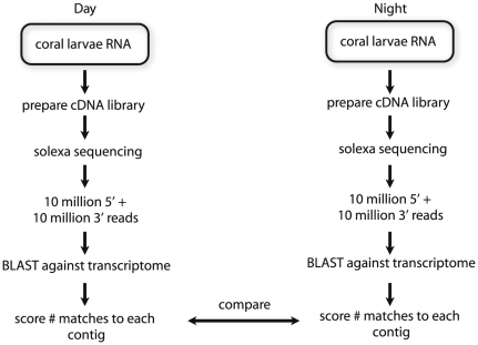 Figure 1. Solexa sequencing data processing pipeline.Detailed steps involved in Solexa deep sequencing of coral larvae samples for both day and night (12 hour difference). Preparation of cDNA library, sequencing and generation of output were performed by the BC Genome Sciences Centre, while all other components were performed by authors.