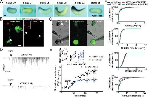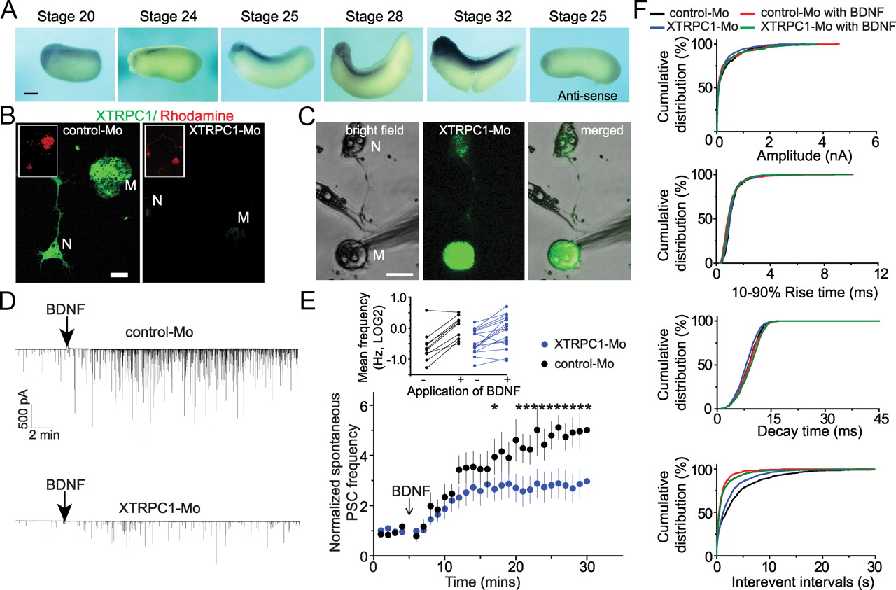 XTRPC1 function is required for BDNF-induced synaptic potentiation at the developing NMJ in culture. A, Sample images of whole-mount in situ hybridization of XTRPC1 in stage 20â32 Xenopus embryos. Scale bar, 0.5 mm. B, Sample images of immunostaining of XTRPC1 (green) in neuron (N)âmyocyte (M) cocultures from embryos coinjected with rhodamine dextran (red) and a specific morpholino against XTRPC1 (XTRPC1-Mo) or a control morpholino (Control-Mo). Scale bar, 10 μm. C, Sample images of recording from a neuron (N) and myocyte (M) pair, both derived from XTRPC1-Mo-injected embryos, as indicated by the presence of fluorescent lineage tracer (green). Scale bar, 20 μm. D, Sample electrophysiological recording traces from control-Mo (top) and XTPRC1-Mo pairs (bottom). Scale bars, 500 pA and 2 min. The addition of BDNF (50 ng/ml; final bath concentration) is indicated by the arrow. E, Fold changes in the frequency of spontaneous PSCs. Values represent mean ± SEM; *p < 0.05 (unpaired two-tailed Student's t test with Welch's correction). Inset: Mean frequency of spontaneous PSCs before and after BDNF application of individual cells plotted in Log2 scale. F, Cumulative distribution plots for the amplitude, 10â90% rise time, decay time, and interevent intervals (p < 0.01; KolmogorovâSmirnov test) of spontaneous PSCs of control-Mo and XTRPC1-Mo pairs before and after the BDNF application (50 ng/ml).