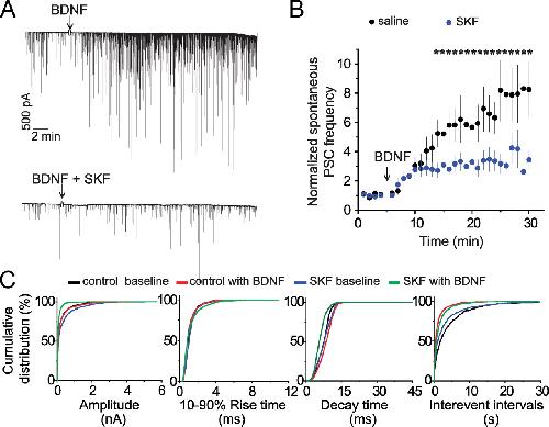 Pharmacological inhibition of XTRPC1 function attenuates BDNF-induced synaptic potentiation at the developing NMJ. A, Sample electrophysiological recording traces with saline (top) or SKF treatment (bottom; 20 μM). The addition of BDNF (50 ng/ml) is indicated by the arrow. Scale bars, 500 pA and 2 min. B, Fold change in the frequency of spontaneous PSCs. Value represent mean ± SEM (control: n = 13; SKF96365 treatment: n = 14); *p < 0.05 (unpaired two-tailed Student's t test with Welch's correction). C, Cumulative distribution plots for the amplitude, 10–90% rise time and decay time, and interevent intervals (p < 0.01; Kolmogorov–Smirnov Test) of spontaneous PSCs under different conditions.