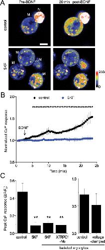 BDNF induces calcium elevations associated with IBDNF, a nonselective cationic current mediated by TRPC channels.
