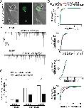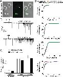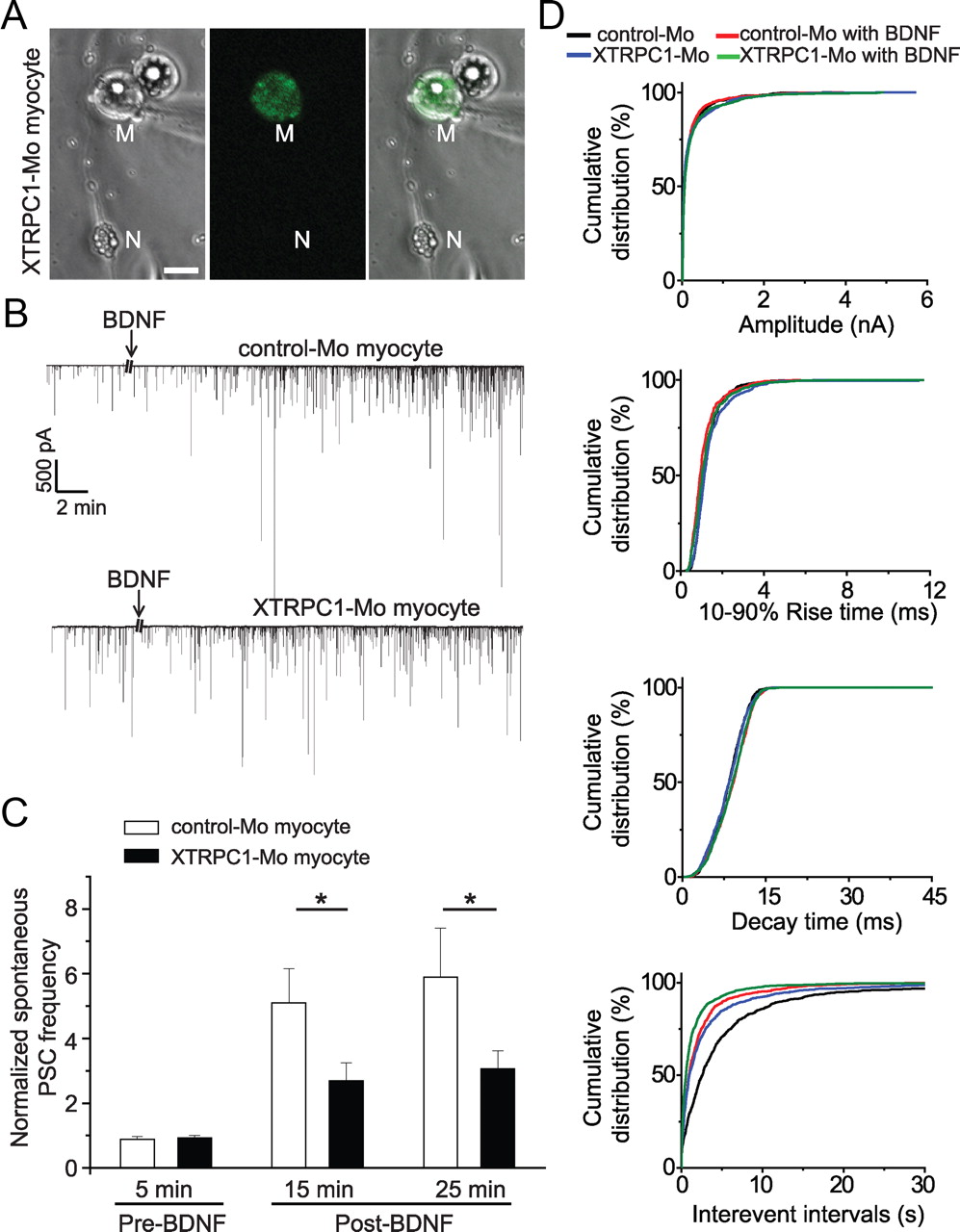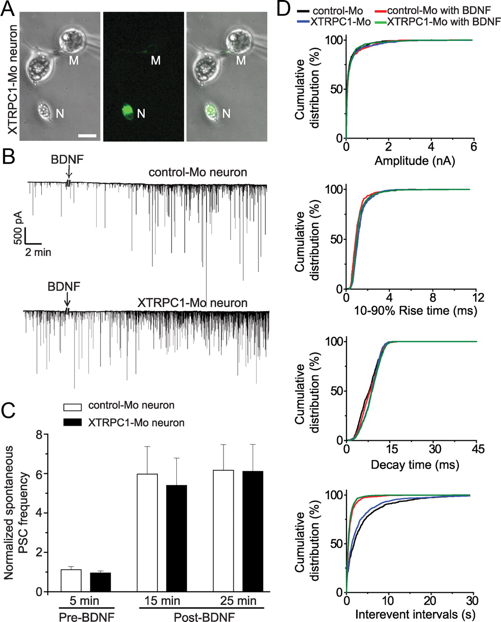 Knockdown of XTRPC1 presynaptically does not affect BDNF-induced synaptic potentiation at the developing NMJ. A, Sample images of recording of a neuron (N) and myocyte (M) pair with only the neuron derived from an XTRPC1-Mo-injected embryo as indicated by the tracer (green). Scale bar, 20 μm. B, Sample electrophysiological recording traces of a control-Mo neuron/wild-type myocyte pair (top) and a XTRPC1-Mo neuron/wild-type myocyte pair. The addition of BDNF (50 ng/ml) is indicated by the arrow. Scale bars, 500 pA and 2 min. C, Fold change in the frequency of spontaneous PSCs. Values represent mean ± SEM. There is no significant difference between control-Mo and XTRPC1-Mo group at each time point (p > 0.1; unpaired two-tailed Student's t test with Welch's correction). D, Cumulative distribution plots for the amplitude, 10–90% rise time, decay time, and interevent intervals (p > 0.05; Kolmogorov–Smirnov Test) of spontaneous PSCs under different conditions.