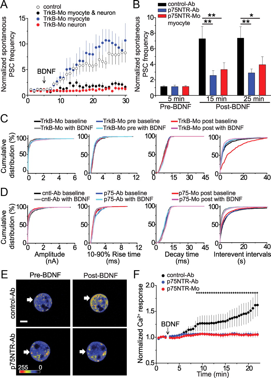p75NTR function is required for BDNF-induced synaptic potentiation and postsynaptic Ca2+ elevation. A, TrkB function is required presynaptically, but not postsynaptically, for BDNF-induced potentiation. Shown is a summary of fold changes in spontaneous PSCs frequency with pairs of NMJs containing morpholino for XTRKB (XTRKB-Mo) in neurons and/or myocytes. The addition of BDNF (50 ng/ml; final bath concentration) is indicated by the arrow. Values represent mean ± SEM; **p < 0.01; *p < 0.05 (Kruskal–Wallis ANOVA test and a Dunn's post-test). B, p75NTR is required postsynaptically for BDNF-induced synaptic potentiation. Shown is a summary of fold changes in spontaneous PSCs frequency after BDNF induction (50 ng/ml) in the presence of NGFR5 or the control antibody (5 μg/ml) or from p75NTR-Mo myocytes. Values represent mean ± SEM; *p < 0.05 (unpaired two-tailed Student's t test with Welch's correction). C, D, Cumulative distribution plots for the amplitude, 10–90% rise time, decay time, and interevent intervals (p < 0.01; Kolmogorov–Smirnov Test) of spontaneous PSCs under different conditions. E, F, p75NTR function is required for BDNF-induced Ca2+ response in myocytes. Shown in E are sample confocal images of Ca2+ responses of the myocytes in the presence of a control antibody (5 μg/ml; top) or NGFR5 (5 μg/ml; bottom). Scale bar, 10 μm. Shown in F is a summary of normalized F/F0 values in the myocytes. Values represent mean ± SEM (n = 9 for NGFR5; n = 7 for control IgG; n = 6 for p75NTR-Mo); *p < 0.05 (unpaired two-tailed Student's t test with Welch's correction).