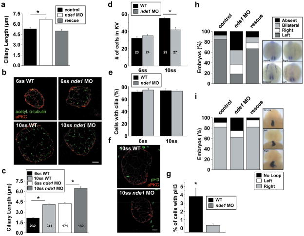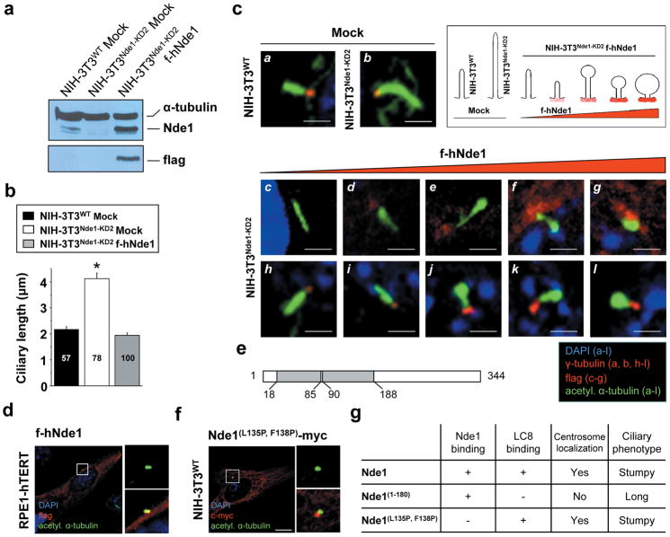 The primary cilium is an antenna-like organelle that is dynamically regulated during the cell cycle. Ciliogenesis is initiated as cells enter quiescence, whereas resorption of the cilium precedes mitosis. The mechanisms coordinating ciliogenesis with the cell cycle are unknown. Here we identify the centrosomal protein Nde1 (nuclear distribution gene E homologue 1) as a negative regulator of ciliary length. Nde1 is expressed at high levels in mitosis, low levels in quiescence and localizes at the mother centriole, which nucleates the primary cilium. Cells depleted of Nde1 have longer cilia and a delay in cell cycle re-entry that correlates with ciliary length. Knockdown of Nde1 in zebrafish embryos results in increased ciliary length, suppression of cell division, reduction of the number of cells forming the Kupffer's vesicle and left-right patterning defects. These data suggest that Nde1 is an integral component of a network coordinating ciliary length with cell cycle progression and have implications for understanding the transition from a quiescent to a proliferative state.