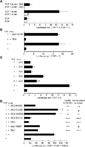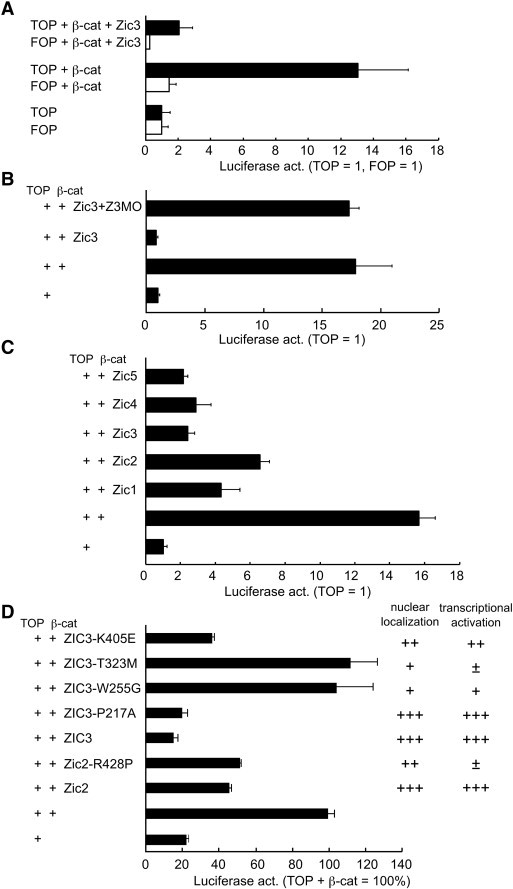 Fig. 5. TOPFLASH reporter gene assay in Xenopus gastrula embryos. The TOPFLASH reporter vector (TOP, 200 pg), FOPFLASH vector (FOP, 200 pg), Flag-tagged β-catenin RNA (β-cateninFT, 300 ng), β-catenin RNA (β-catenin, 300 ng), Myc-tagged Zic RNA (Zic1âZic5, 200 pg each), and/or Zic3 were injected into animal pole regions of both blastomeres of 2-cell-stage embryos in the indicated combinations. The TOPFLASH reporter vector contains Tcf-binding sites upstream of the promoter region, whereas the Tcf-binding sites are mutated in the control FOPFLASH vector. Embryos were collected at stage 10.5 in pools of 5 embryos, and assayed for luciferase activity in triplicate (total of 15 injected embryos for each value). The activity was normalized by the protein amount in the sample lysate. Mean luciferase activities of embryos injected with the TOP or FOP reporter vector only are defined as one relative luciferase unit (RLU) in each experiment. Error bars indicate standard deviation. (A) Co-injected β-catenin increased luciferase activity in the presence of the TOP reporter (TOP + β-cat). The increase was attenuated by Zic3 RNA co-injection (TOP + β-cat + Zic3). (B) This inhibition was rescued by co-injection of Zic3MO (Z3MO). (C) Comparison among the Xenopus Zic family members for the β-catenin-suppressing activities. (D) The effects of nuclear localization extent and transcriptional activation abilities of Zic3 or Zic2 mutants. Approximate nuclear localization extents and transcriptional activation abilities are indicated as follows: +++, ⥠100; ++, 80â60; +, 50â30; ±, ⤠20; where values of wild type Zic2 or Zic3 are 100. The values are based on previous studies [ZIC3-P217A, ZIC3-T323M, and ZIC3-K405E (Ware et al., 2004); ZIC3-W255G (Hatayama et al., 2008); Zic2-R428P (Hatayama et al., 2011)].