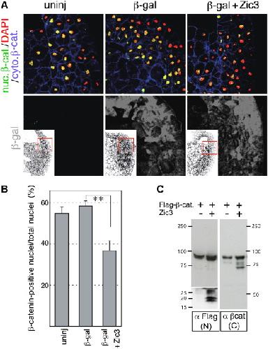 Fig. 6. β-catenin nuclear localization is impaired by Zic3 expression in gastrula embryos. (A) Representative images for β-catenin immunofluorescence staining. Neighboring sections were stained with anti-β-catenin and anti-β-galactosidase (β-gal) antibodies. In each image, the animal pole is at the top and the dorsal side is to the right. Upper images show the β-catenin signal (nuclear, green; non-nuclear, blue) and DAPI signal (nuclear, red), and lower images show the β-galactosidase signal (gray) of the injected area. The yellow indicates the overlapping of nuclear β-catenin and DAPI signals. The insets are low magnifications in which the boxed regions indicate the stained regions. (B) The graph shows percentages of the β-catenin/DAPI double-positive cell nuclei area among the total DAPI-stained cell nuclei in the organizer region. Nuclear transported β-catenin was significantly lower in Zic3-injected embryos. **P < 0.01, KruskalâWallis test followed by SteelâDwass post hoc test. Error bars, standard error of the mean. (C) Immunoblotting analysis for β-catenin. Embryos were injected with the β-catenin or (β-catenin and Zic3) RNA. Immunoblotting of the embryo tissue lysate using an antibody against the anti-β-catenin C-terminus (β-cat.) or an antibody against the Flag-tag located on the N-terminus of β-catenin (Flag). Zic3 RNA co-injection enhanced the degradation of β-catenin.