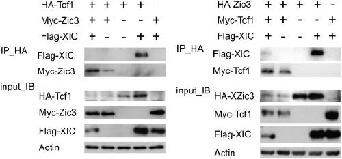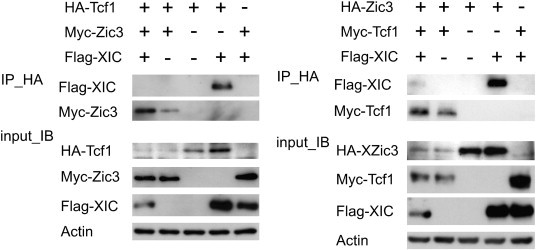 Fig. 7. Zic3 can physically interact with Tcf1 and XIC. Immunoprecipitation experiments indicating the physical interaction among Zic3, Tcf1, and XIC. Epitope-tagged Xenopus Tcf1, Zic3, and XIC were expressed in COS7 cells in the indicated combinations. Following immunoprecipitation (IP) with an anti-HA-tag antibody (IP_HA), the co-precipitated proteins were detected with an anti-Myc-tag antibody. The cell lysates (input) used for the immunoprecipitation experiments were also subjected to an immunoblot analysis (input_IB) using the antibodies against the epitope tags (HA, Myc, and Flag) and actin. Both the Tcf1 (left) and Zic3 (right) pull-down experiments suggested that Zic3 and Tcf1 physically interacted, and that this interaction was enhanced by XIC. XIC was co-precipitated with both Zic3 and Tcf1.
