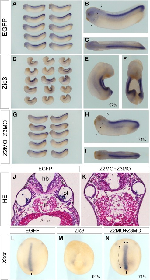 Fig. 1. Zic3 has a role in notochord development. EGFP RNA alone (AâC, J, L; EGFP, 400 pg) or EGFP RNA (400 pg) with Myc-tagged Zic3 RNA (DâF, M; Zic3, 200 pg) or Zic morpholino oligos (GâI, K, N; Z2MO + Z3MO, Zic2MO and Zic3MO, 30 ng each) were injected into the dorsal marginal zone of the two dorsal blastomeres of embryos at the 4-cell stage. The embryos were fixed at the tailbud stage (AâK, stage 33) or early neurula stage (LâN, stage 14). In panels AâI, expression of the posterior neural marker HoxB9 was analyzed by whole-mount in situ hybridization (WMISH; lateral view is shown in A, B, D, E, G, and H, and dorsal view is shown in C, F, and I). Panels J and K are hematoxylin-and-eosin-stained transverse sections of the embryos shown in panels B and H respectively (dashed lines indicate the section planes). n, notochord; hb, hindbrain; ot, otic vesicle. In panels LâN, expression of the notochord marker Xnot was analyzed by WMISH (n = 35â39). Images show dorsal views of the embryos. The indicated percentages of embryos had phenotypes similar to those shown in the images. Arrowheads, blastopores; long and short arrows, the rostrocaudal and leftâright extent of Xnot expression.