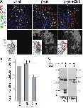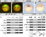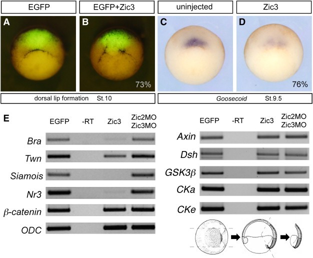 Fig. 2. Organizer formation is impaired by Zic3 overexpression. EGFP RNA alone (A; EGFP, 400 pg), EGFP RNA (400 pg) with Myc-tagged Zic3 RNA (200 pg) (B; EGFP + Zic3), or Myc-tagged Zic3 RNA alone (200 pg) (D; Zic3) were injected into the dorsal marginal zone of the dorsal two blastomeres of embryos at the 4-cell stage. The injected embryos and an uninjected sibling embryo (C) were observed at stage 10 (A, B) or stage 9.5 (C, D). (A, B) Green EGFP signals derive from the injected RNA. Dorsal lips were frequently defective in embryos with Zic3 RNA injection (73%, n = 16). (C, D) Expression of an organizer marker gene (Goosecoid) was analyzed by WMISH. Reduction of Goosecoid expression was frequently observed in the Zic3 RNA-injected embryos (76%, n = 27). (E) RT-PCR analysis. EGFP RNA alone (EGFP, 400 pg), EGFP RNA (400 pg) with Myc-tagged Zic3 RNA (200 pg) (Zic3), or EGFP RNA (400 pg) with Zic morpholino oligos (30 ng each) (Zic2MO + Zic3MO) was injected into the dorsal marginal zone of the dorsal two blastomeres of embryos at the 4-cell stage. At stage 10.5, the dorsal part was dissected as in bottom cartoon and used for total RNA extraction. Direct targets of β-catenin (Bra, Twn, Siamois, and Nr3) were downregulated by the Zic3 RNA injection, whereas genes in the Wnt/β-catenin signaling cascade (β-catenin, Axin, Dsh, GSK3β, CKα and CKε) and a housekeeping gene (ODC) were not changed. The cDNA synthesis reaction for the sample injected with EGFP RNA alone was also performed without reverse transcriptase (-RT) to confirm the absence of chromosomal DNA contamination.