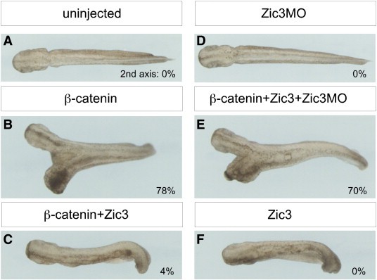 Fig. 4. Zic3 inhibits secondary axis formation induced by ectopic β-catenin. Typical shapes of the tailbud stage embryos (stage 33, dorsal view) subjected to the second axis formation assay are shown. Percentages given below indicate the embryos with secondary axis among 43â50 embryos for each experimental group. Flag-tagged β-catenin RNA (200 pg) injected into the ventral marginal zone at the 4-cell stage frequently induced the secondary axis structure (B; β-catenin, 78%). The secondary head structure was rarely observed after co-injection of Flag-tagged β-catenin RNA (200 pg) and Zic3 RNA (50 pg) (C; β-catenin + Zic3, 4%). The suppression of the secondary axis effect by Zic3 RNA was abolished by Zic3MO (10 ng) (E; β-catenin + Zic3 + Zic3MO, 70%). There were no embryos with ectopic heads in Zic3MO-injected (D; Zic3MO, 0%), Zic3 RNA-injected (F; Zic3, 0%), or control embryos without injection (A; uninjected, 0%).