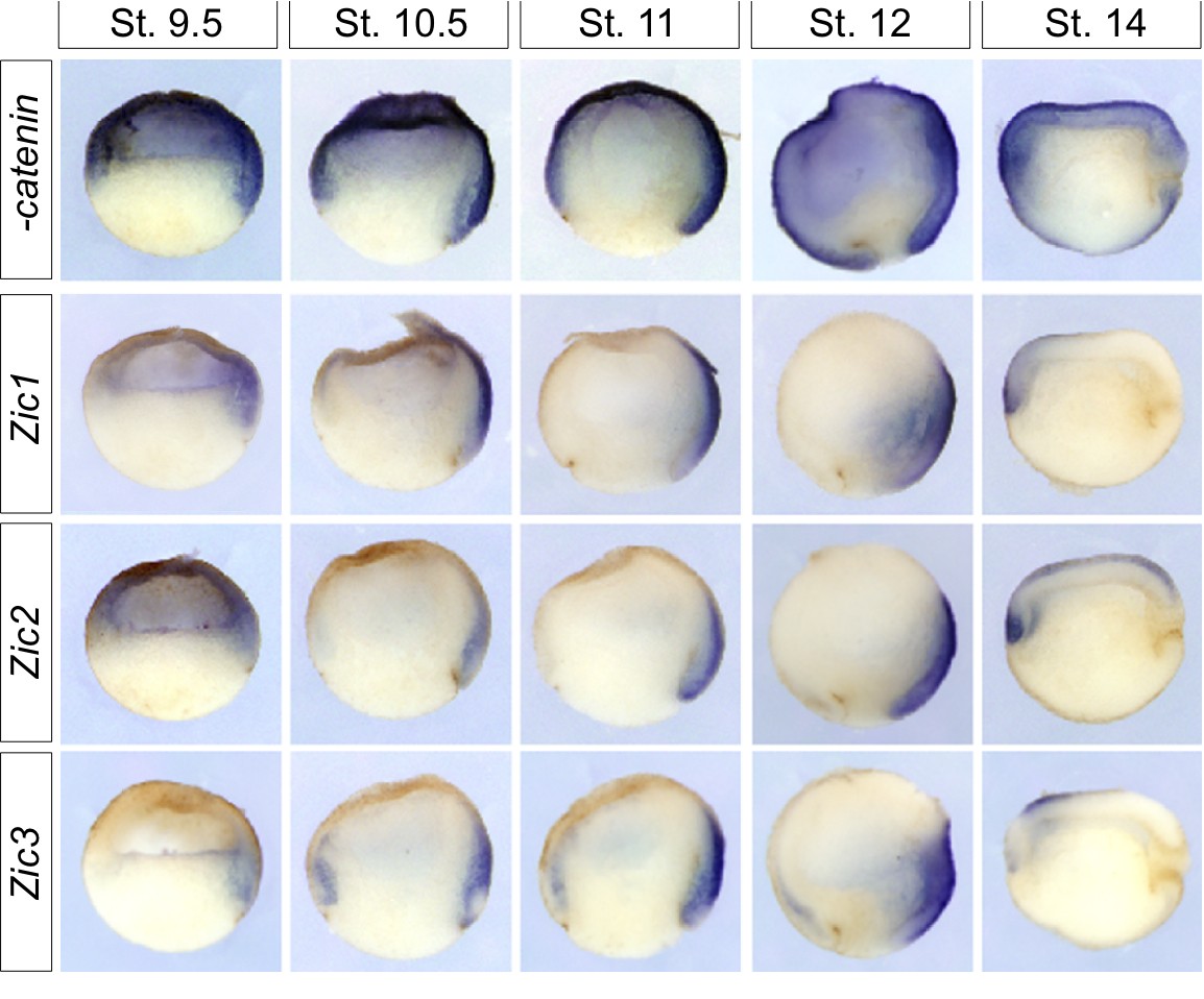 Supplemental figure 1. Expression profiles of Zic and β-catenin from early gastrula to neurula stages Spatial expression patterns of Xenopus Zic1, Zic2 and Zic3 were examined with whole-mount in situ hybridization analysis with a series of cut embryos at various stages from late blastula [Stages (St.) 9.5-9.75] to neurula (St.14). The three Zic genes were chosen for the analysis because they were expressed strongly during gastrulation (Supplemental figure 2). The animal pole is up and dorsal is right. At early gastrula stages, the expression of Zic genes was observed in the dorsal mesoderm area. Zic1, Zic2, and Zic3 expression was observed in the dorsal involuting mesoderm area, as well as in neuroectoderm, throughout the gastrula stages (St. 10.5, 11, 12). Zic3 expression was clearly observed in whole involuting mesoderm surrounding yolk plug, as well as previously reported (Kitaguchi et al., 2000). Zic expression in gastrula mesoderm mostly overlapped with that of β-catenin.