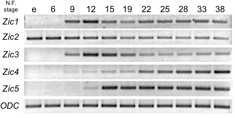 Supplemental figure 2. Temporal expression patterns of Zic genes The temporal expression patterns of Zic genes were determined by RT-PCR analysis. Staging was done according to Nieukoop and Farber (1967) (N.F. stage). Zic1 showed strong expression in early stages: Zic2 was maternally expressed, and Zic1 and Zic3 expression began at the gastrula stage. The primers for Xenopus Zic4 detection were F: 5â²-TCTCAGTGACTACTGCCA-3â² and R: 5â²-GACATGAAGAATTCACCGTC-3â². Other primers for Xenopus Zic genes were as previously described (Nakata et al., 2000). e, unfertilized egg.