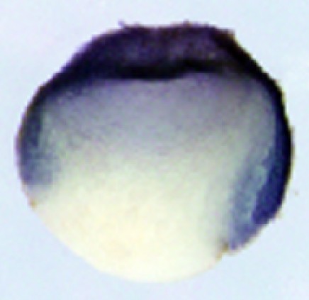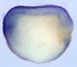 ctnnb1 (catenin beta 1) gene expression in bisected Xenopus laevis embryo, NF stage 11, as assayed by in situ hybridization, lateral view, dorsal left.