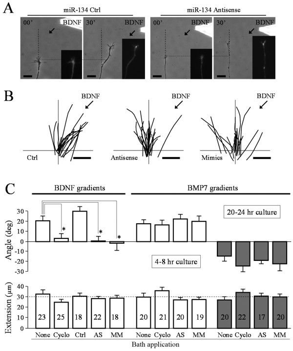 Figure 3. Blockade of BDNF-induced growth cone turning by miR-134 mimic and antisense oligonucleotides. (A) Representative images of growth cones at the beginning and the end of 30 min exposure to a BDNF gradient. Dashed lines indicate the original direction of growth cone extension. Dotted lines indicate the position of the growth cone at the onset of the turning assay. Insets are fluorescent images of the same growth cones, showing the presence of the fluorescent tracer FITC-dextran co-injected with miR-134 mimic or antisense. (B) Trajectory tracings of all the growth cones subjected to 30 min turning assay in a BDNF gradient. Neurons injected with control oligonucleotides (Ctrl), miR-134 antisense inhibitors or mimics are shown here. The origin is the center of the growth cone at the onset of the BDNF gradient and the original direction of growth cone extension is vertical. Scale bars: 20 μm. Arrows indicate the direction of the BDNF gradient. (C) Average turning angles (top) and net extension (bottom) of different groups of all the growth cones examined. Numbers indicate the total number of growth cones examined for each group. Each group is labeled at the bottom: None: neurons not treated; Cyclo: bath application of cycloheximide; Ctrl: neurons injected with miR-134 control oligonucleotides; AS: injected with miR-134 antisense inhibitors; MM: injected with miR-134 mimics. Error bars represent the standard error of the mean. Asterisks depict the statistical significance (p < 0.01, Mann-Whitney test).
