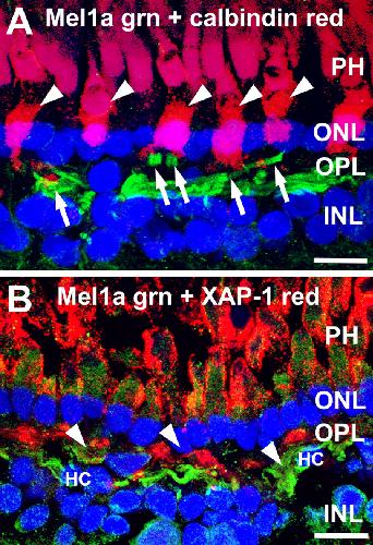 Figure 7. Mel1a melatonin receptor-immunoreactive processes in the outer plexiform layer (OPL) contact cone photoreceptor terminals. A: Branches of Mel1a-immunoreactive processes (green; arrows) ascend through the OPL to contact the terminals of calbindin-immunoreactive cone photoreceptors (red; arrowheads) terminals. Confocal image stack comprised of 11 optical slices of â400 nm each. B: Mel1a melatonin receptor-immunoreactive processes (green; arrowheads) in the OPL contact XAP-1-immunoreactive cone photoreceptor terminals (red). The extracellular matrix surrounding the inner and outer segments of the photoreceptors is also XAP-1-immunoreactive. Confocal image stack comprised of 10 optical slices of â400 nm each. Nuclei are counterstained with DAPI (blue) in both panels. PH, photoreceptor inner segments; ONL, outer nuclear layer; INL, inner nuclear layer. Scale bars = 10 μm in both panels.