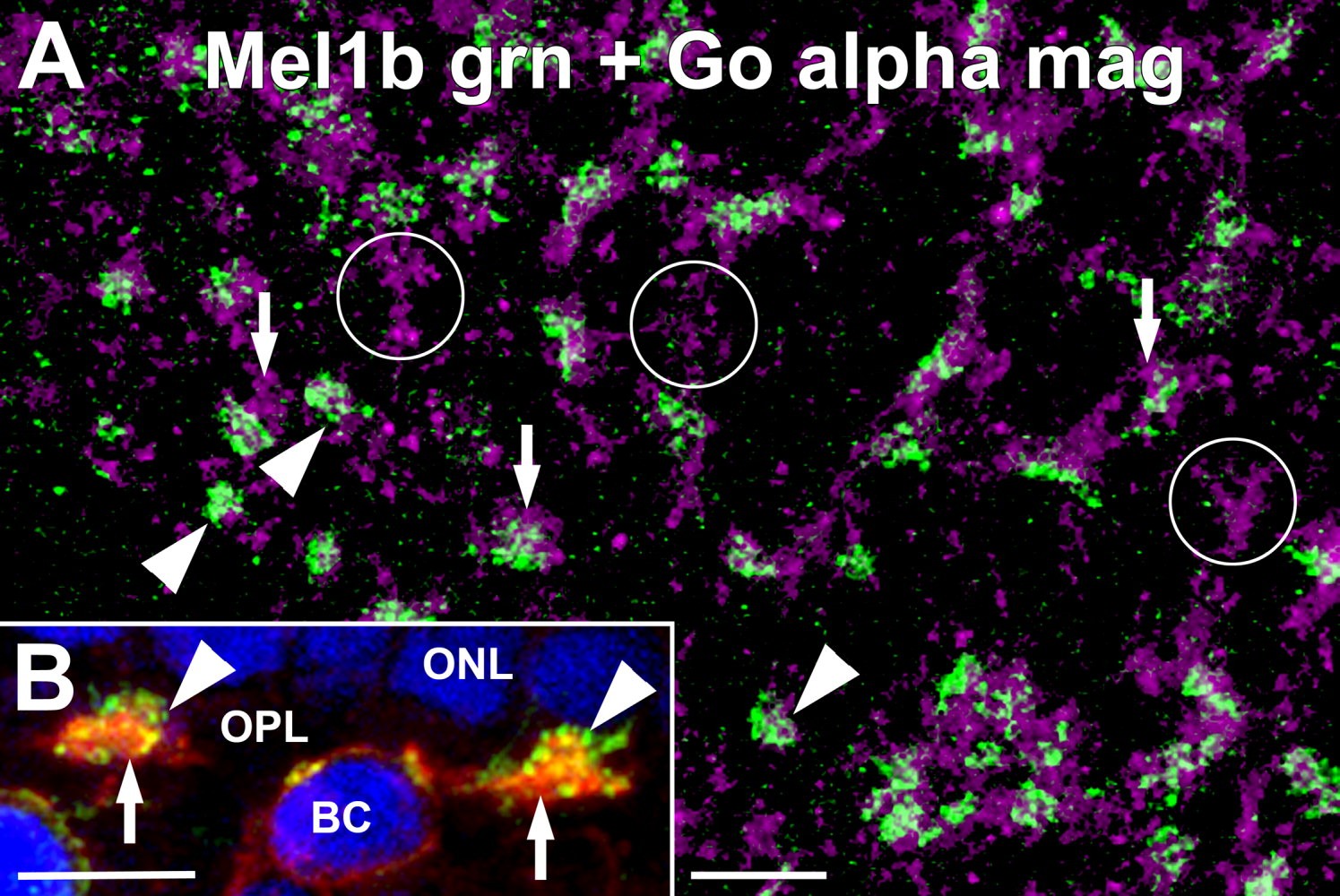 Figure 5. Mel1b receptor-immunoreactive OFF bipolar cell dendrites and ON bipolar cell dendrites are spatially segregated at cone terminals. A: Immunolabeling for Mel1b (green) and Goα (magenta) in a retinal flatmount preparation focused at the level of the outer plexiform layer (OPL). Mel1b-immunoreactive OFF bipolar cell dendrites (arrowheads) and Goα-immunoreactive ON bipolar cell dendrites (arrows) both contact the same cone terminals, but tend to contact cone terminals in discrete locations. Occasionally, cone terminals receiving numerous contacts from Goα-immunoreactive ON bipolar cell dendrites, but little or no contacts from Mel1b-immunoreactive OFF bipolar cell dendrites were observed (circles), suggesting that Mel1b-immunoreactive OFF bipolar cells may not contact all cone types equally. Confocal image stack comprised of nine optical slices of ≈400 nm each. B: Mel1b (green) and Goα (red) immunolabeling in the OPL in vertical frozen sections of retina shows that Mel1b-immunoreactive OFF bipolar cell dendrites (arrowheads) penetrated slightly deeper into the cone terminals than Goα-immunoreactive ON bipolar cell dendrites (arrows). An ON bipolar cell body (BC) labeled for Goα is also visible. Nuclei are counterstained with DAPI (blue). Confocal image stack comprised of seven optical slices of 400 nm each. Scale bars = 10 μm for both panels.