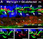 Figure 6. Mel1a receptors are not expressed in ON bipolar cell dendrites. A: Labeling for Mel1a receptor (green) and Goα (red) localize to different processes in the outer plexiform layer (OPL). Mel1a receptors are expressed in distinctive processes morphologically similar to horizontal cell axons (large arrows). These processes are distinct from the Goα-immunoreactive ON bipolar cell dendrites (arrowheads). Apparent colocalization of Mel1b and Goα immunoreactivity in processes in the outer plexiform layer (OPL) is due to their close proximity and the relative thickness of the image stack, and does not represent genuine colocalization (see panels BâD, below). Mel1a immunoreactivity also is present in puncta throughout the inner plexiform layer (IPL; small arrows) and in ganglion cell axons (long arrows) in the nerve fiber layer (NFL). Confocal image stack comprised of 15 optical slices of â400 nm each. The box indicates the area shown in panels BâD. BâD: Examination of thin stacks of confocal optical planes confirms that Mel1a labeling is not localized to ON bipolar cell dendrites. Images in panels BâD are comprised of five optical slices of â400 nm each. B: Mel1a immunoreactivity in horizontal cell axons (arrowheads) in the OPL. C: ON bipolar cell dendrites labeled for Goα (small arrow). D: Overlay of panels B,C showing that ON bipolar cell dendrites (Goα-positive) and Mel1a receptor-positive processes are not colocalized. Nuclei are counterstained with DAPI (blue) in all panels. BC, Bipolar cell; PH, photoreceptors; IPL, inner plexiform layer; NFL, nerve fiber layer. Scale bars = 10 μm in all panels.