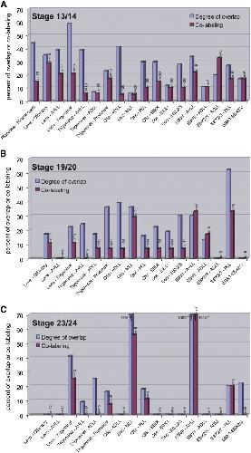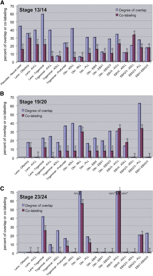 Fig. 5. Overlap versus co-labeling of selected adjacent placodes at neural plate stages (A), at the end of neurulation (B) and at early tailbud stages (C). The degree of overlap (blue columns) was measured as percent of area of origin of first placode which overlapped with area of origin of second placode. Areas were defined by polygons enclosing all injection sites giving rise to a particular placode in fate maps and measured with ImageJ. Co-labeling (maroon columns) was determined as percent of all injection sites contributing to first placode (n) which also contributed to second placode. Columns marked with an asterisk in C are not very informative since the facial epibranchial placode was labeled by only a single injection site. Abbreviations: ADLL: anterodorsal lateral line; AVLL: anteroventral lateral line; EBVII: Facial epibranchial; EBIX: Glossopharyngeal epibranchial; EBX1: First vagal epibranchial; EBX2/3: Second and third vagal epibranchial; MLL: middle lateral line; PLL: posterior lateral line.