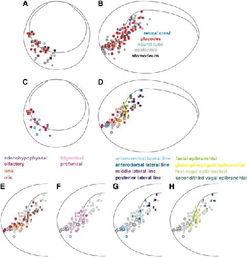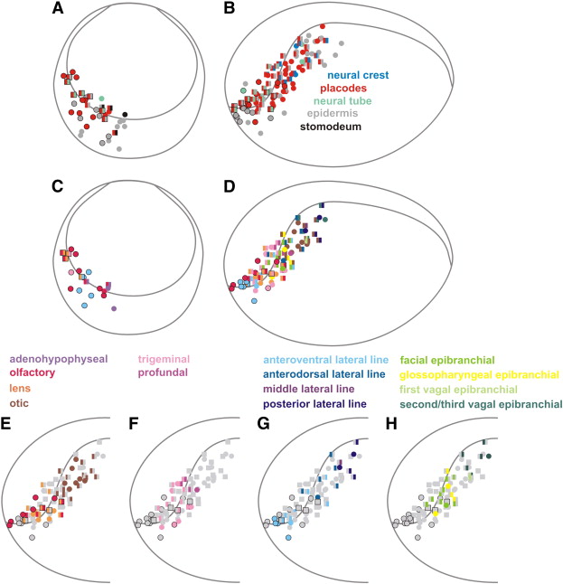 Fig. 6. Fate map of Xenopus dorsal cranial non-neural ectoderm at the neural plate stage (stage 13/14). Each symbol represents one dye injection which contributes to a single placode or other ectodermal fates (circle) or to multiple placodes and/or other ectodermal fates (square). Black outlined circles and squares represent injections shown in frontal views as well as in lateral views. The inner gray colored line marks the ventral border of the outer neural folds. Frontal views are shown in A and C and lateral views in B, DâH. Note that only a subset of rostral injection sites mapped from a lateral view were also mapped from a frontal view. A, B: Positions of placodal precursors (red symbols) in relation to precursors of the neural tube (mint symbols), neural crest (blue symbols), epidermis (light gray symbols) and stomodeum (black symbols). All placodes arise from a crescent-shaped area around the anterior neural plate, the pre-placodal ectoderm. C, D: Positions of precursors for different types of placodes (color coded as indicated). There is extensive overlap and co-labeling of precursors for adjacent placodes. EâH: For clarity, these diagrams highlight injection sites contributing to particular subsets of placodes, while injections which contribute to other placodal fates are shown as light gray symbols. E: Adenohypophyseal, olfactory, lens and otic placodes. F: Trigeminal and profundal placodes. G: Lateral line placodes. H: Epibranchial placodes. For detailed explanation see text.