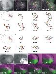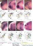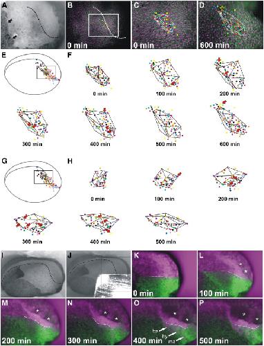 Fig. 11. Cell movements within the non-neural ectoderm (lateral views, anterior is to the right). AâD: Time lapse imaging of deep ectodermal layer in embryo expressing MEM-GFP (green membranes) and H2B-RFP (red nuclei, here shown in magenta false-color) from neural plate stage on until early tailbud stages (600 min). The superficial ectodermal layer was removed. A: Brightfield image of embryo at the beginning of the recording. Hatched line indicates ventral border of neural folds. Arrows indicate border of superficial ectodermal layer. B: Superimposition of both fluorescent channels for embryo at the beginning of the recording. A group of randomly selected cells were color coded (dots) to allow tracking of their positions with ImageJ. C: Magnified view of boxed area in B. Some of the tracked cells are connected by white lines to facilitate visualization of changes in their relative positions over time. D: Same region after 600 min. E, G: Tracking of movements of selected cells for the embryo depicted in AâD. Some tracked cells are connected by black lines. E: Position of tracked cells (grid) in relation to the neural plate stage fate map. F: Changes in positions of tracked cells over time due to cell division (red arrows) and local cell rearrangement. G, H: Similar analysis for time lapse movie of a different embryo. IâP: Time lapse imaging of deep ectodermal layer in embryos expressing EosFP from neural plate stage on for 500 min. I: Bright- field image of embryo after removal of the superficial ectodermal layer. Hatched line indicates ventral border of neural folds. J: Part of the embryo was covered with aluminum foil and UV irradiated for photoconversion of EosFP resulting in a sharp boundary between photoconverted (red; here shown in magenta false-color) and unconverted (green) fluorescent cells. KâP: Magnified view of anterior end of embryo depicted in I and J with superimposition of both fluorescent channels. The sharp border created by photoconversion of EosFP (dashed white lines) within the deep ectodermal layer largely persists until early tailbud stages. Because a large part of the neural plate and the neural crest was photoconverted in this embryo, the ventral migration of neural crest cells (magenta) underneath the deep layer of the ectoderm can be seen (indicated by white arrows in O). From 100 min on, a space begins to open up in the dorsal part of the embryo (asterisks), probably due to the delamination of neural crest cells (this was observed in several embryos after removal of the superficial ectodermal layer). Abbreviations: ba: branchial neural crest stream; hy: hyoid neural crest stream; ma: mandibular neural crest stream.